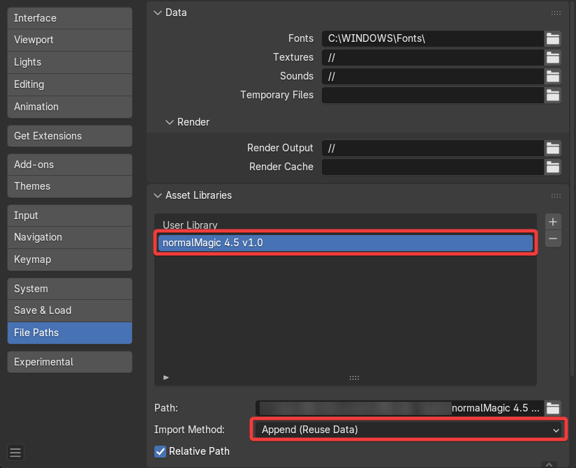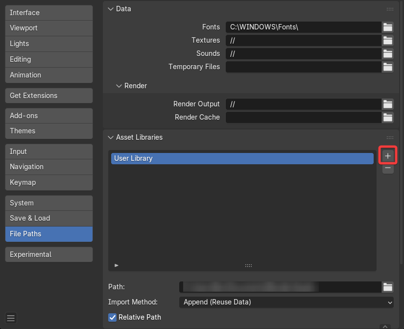 3. Open Blender and go to Edit/Preferences/File Paths/Asset Libraries.