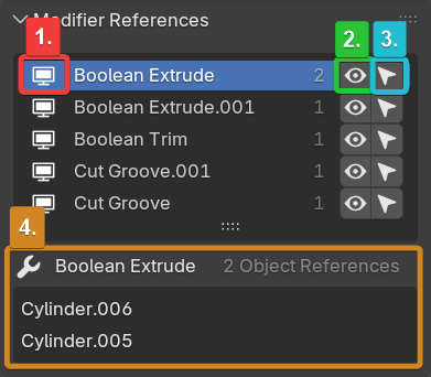 The main list displays every modifier on the active object that references other objects. Selecting a modifier will also select it in the object's modifier panel and display it's individual references below.