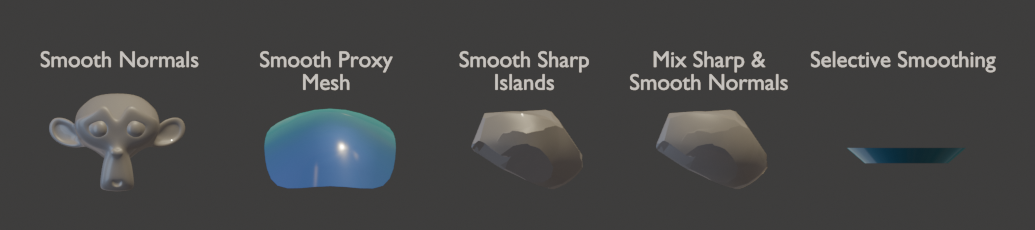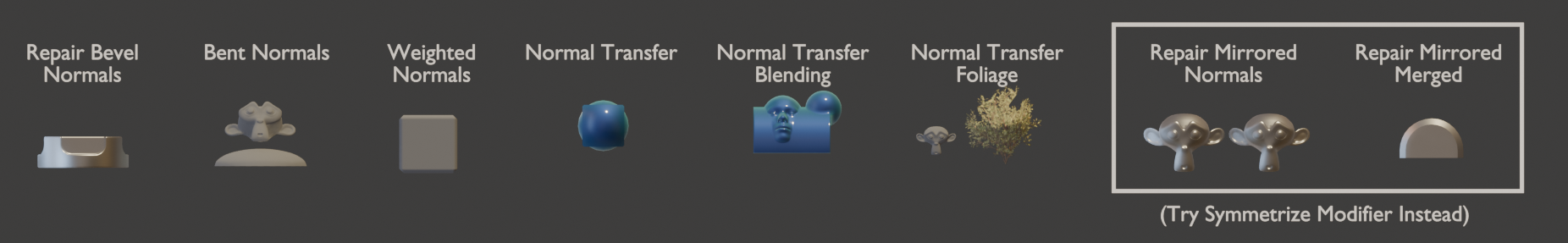 Examples for normal modifiers in use: Repair Bevel Normals, Bent Normals, Face Weighted Normals, Repair Mirrored Normals, Normal Transfer.